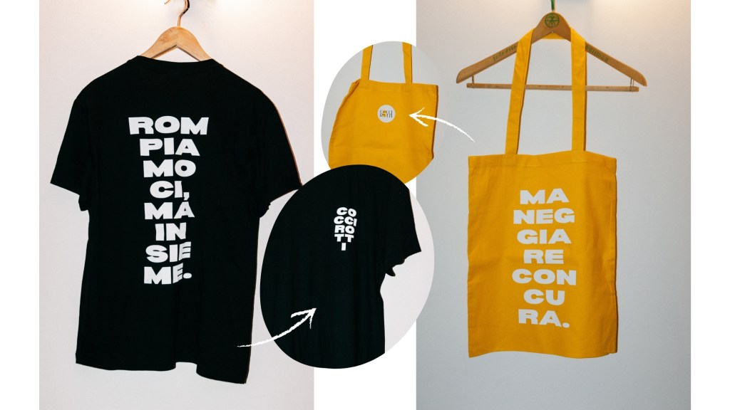 L’idea, questa volta, è stata quella di unire il senso di fragilità (positiva, s’intende) tipico dei cocci e di comunità (che vogliamo creare), con un aggancio interessante, a passo coi tempi. Slogan pronti per essere indossati!